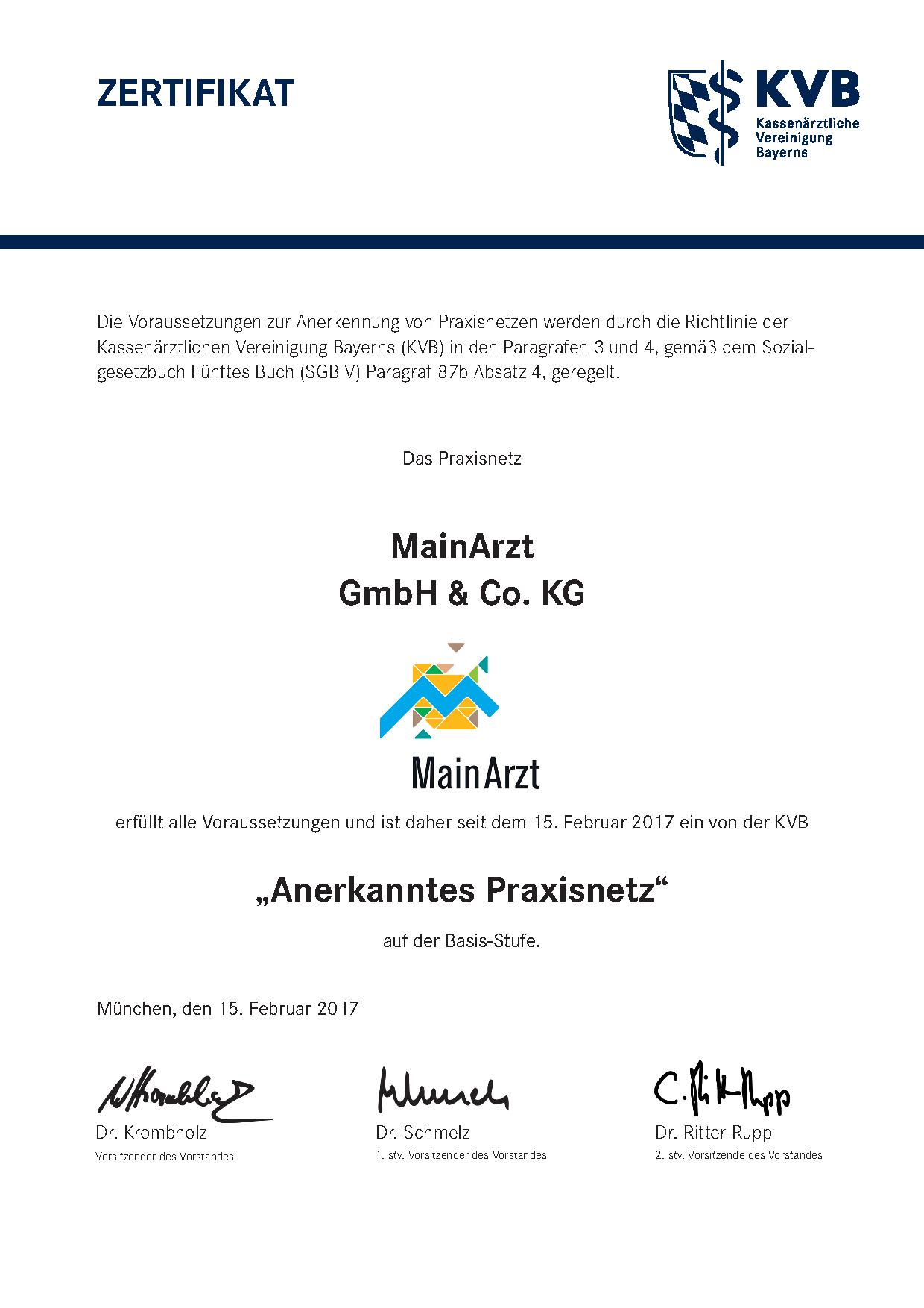 Seit dem 01. Mai 2018 ein von der Kassenärztliche Vereinigung Bayerns (KVB) „Anerkanntes Praxisnetz“ im Sinne des § 87b SGB V in der Stufe 1